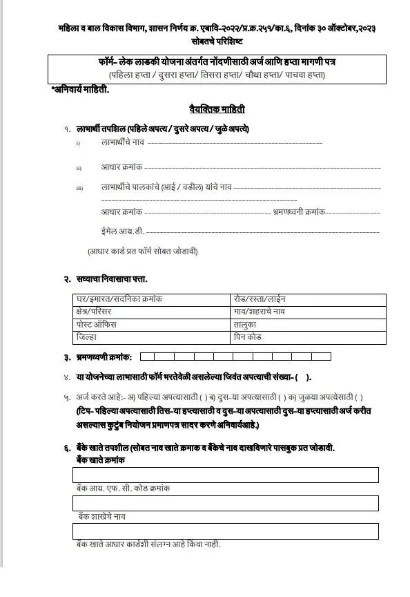 सरकारी कार्यालयात “लेक लाडकी योजना अर्ज फॉर्म” मागावा. अनेक ठिकाणी PDF उपलब्ध असते, ती प्रिंट करूनही नेता येते.