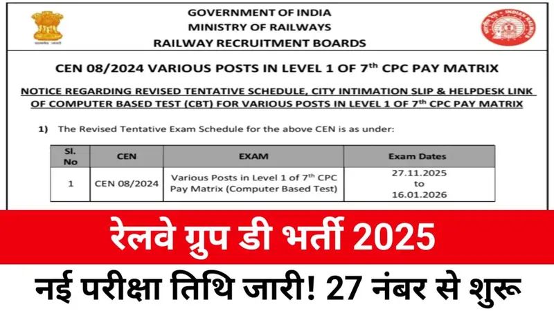 रेलवे ने अपने आधिकारिक नोटिस में बताया कि परीक्षा अब 27 नवंबर 2025 से 16 जनवरी 2026 तक आयोजित की जाएगी।